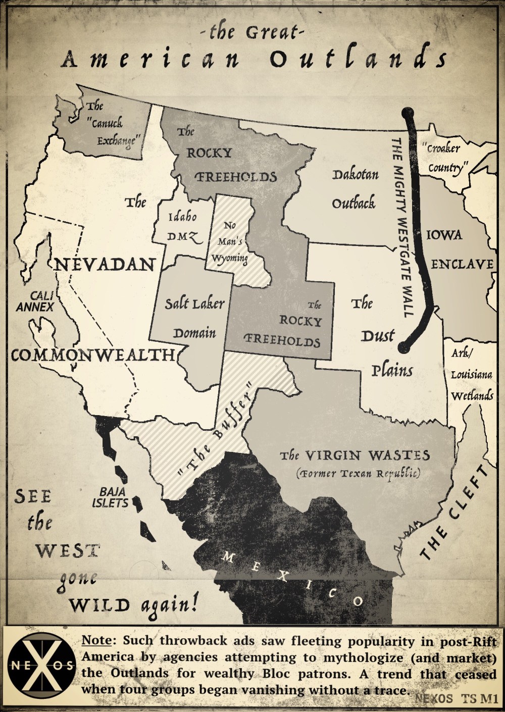 OUTLANDS, THE: blanket term for any North American region outside the jurisdiction of the New-East American Bloc and, therefore, not subject to its laws, regulations, and, in many cases, technological conveniences. As such, many Bloc citizens consider them barbaric lands fallen into a neo-Dark Age (a decidedly insular assessment).